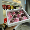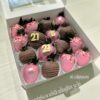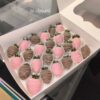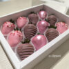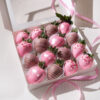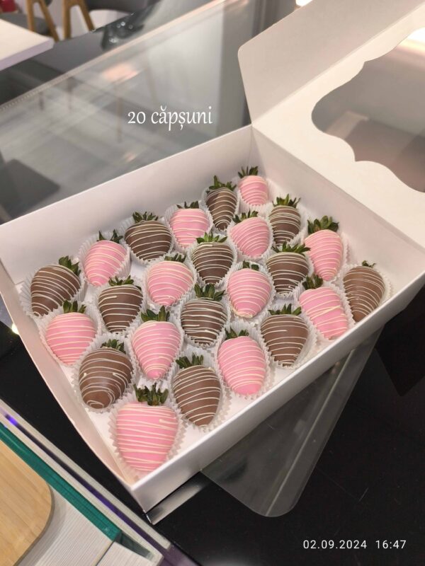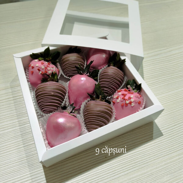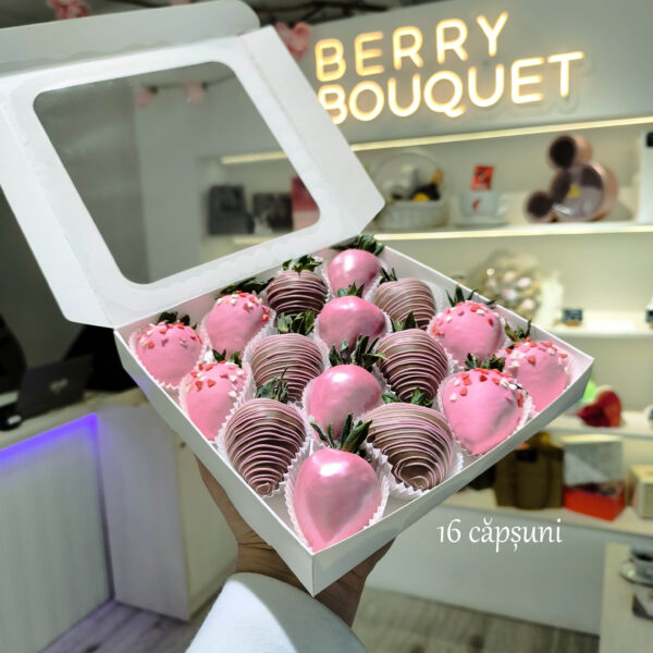 Cutie cu capsuni in ciocolata belgiana in decorul „Belgian Pink”;