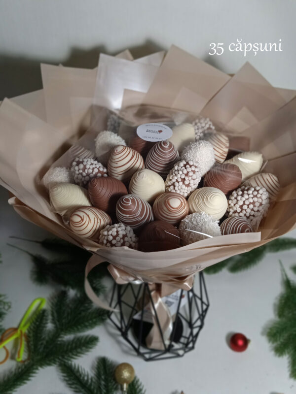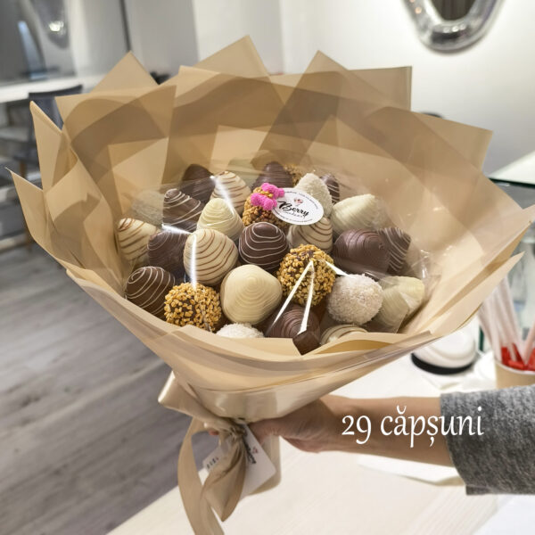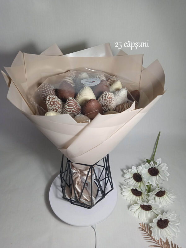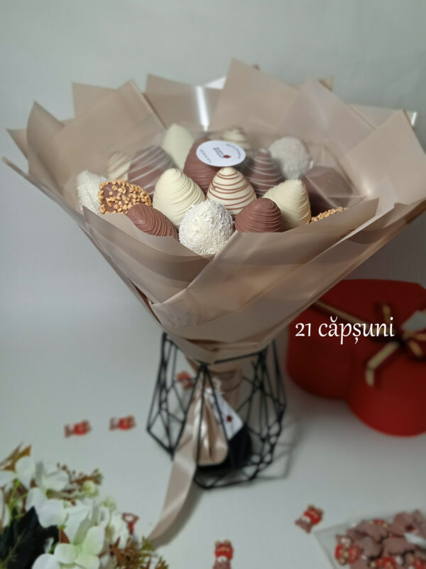 Cufundați-vă în lumea delicateții și a gustului cu buchetul nostru splendid de căpșuni acoperite cu ciocolată belgiană rafinată!